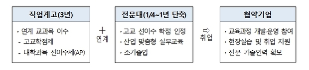 - 전문대학이 직업계고‧기업과 손잡고 연합체(컨소시엄)를 구성해 교육과정 연계 주도, 지역산업에 필요한 전문 기술인재 조기 배출